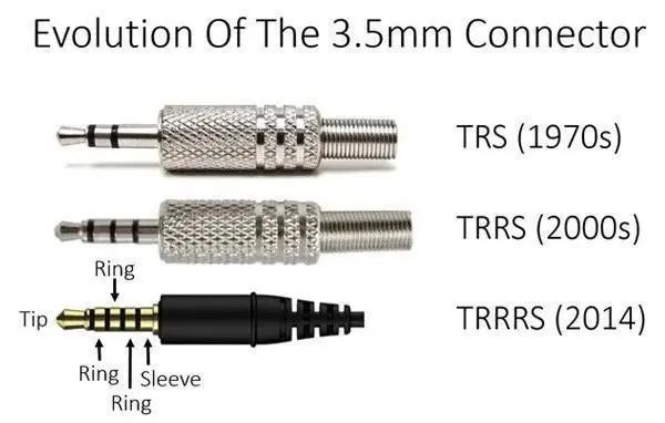 这些触点也有约定俗成的名字,分别用T、R、S三个字母表示。T(Tip)表示尖端,R(Ring)表示中环,可以有一个或多个R,S(Sleeve)表示末端环套。最初的3.5毫米耳机接口只能发出单声道的声音,但很快就建立了立体声标准,Sleeve连接到地面,Tip和Ring连接到左右声道上;而在需要麦克风的情景下解决方法很简单 —— 添加第二个Ring,形成一个TRRS接口。