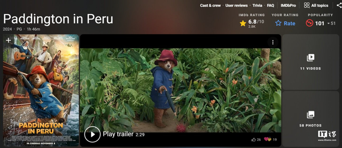 《帕丁顿熊 3:秘鲁大冒险》已于 11 月 8 日在英国上映。IT之家查询获悉,该电影目前 IMDB 评分 6.8(满分 10 分),豆瓣暂无评分。