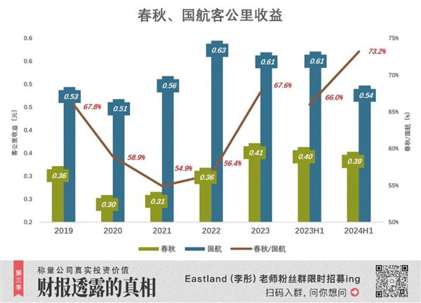 2024年前三季,春秋客公里收益0.54元,相当于国航的73.2%;