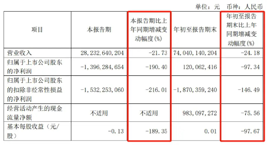 根据财报显示,今年第三季度广汽实现营业收入282.33亿元,同比下滑21.73%;归属于上市公司股东的净利润为-13.96亿元,同比下滑190.40%;归属于上市公司股东的扣除非经常性损益的净利润为-15.32亿元,同比下滑216.01%。