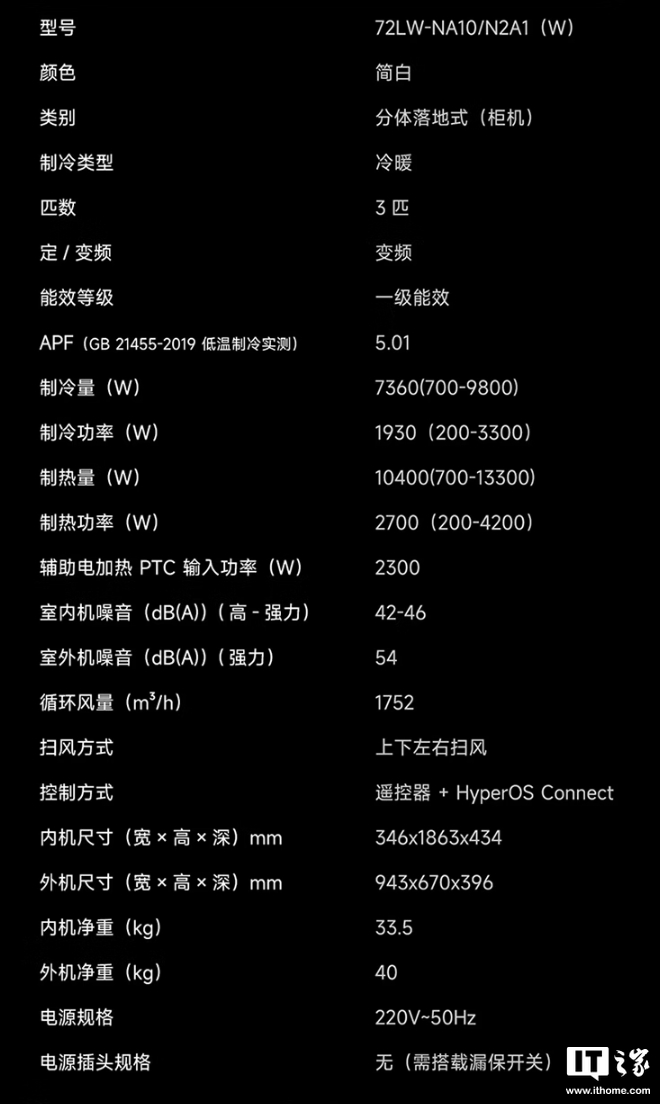 小米米家空调巨省电 Pro 立式 3 匹(超一级能效)制冷功率达 1930W,制热功率达 2700W,内机噪音最高 46dB,IT之家附参数表如下: