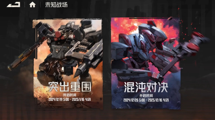 玩法上,制作组也推出了偏向休闲,强调游戏性的“未知战场”。新玩法分为两个模式,“突出重围”和“混沌战场”。无关乎玩家本身的练度,“突出重围”模式中玩家操控的机师和机兵都由系统随机提供,并且可以将多个机师角色的技能集合到一个机师上,虽然机兵的搭配固定,但玩家能从所有机师的技能库中抽取技能,自由筑建想要的机师技能组合。