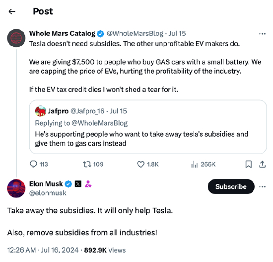 虽然特斯拉早期享受了美国政府和加州政府的大量补贴,但马斯克却表示自己支持特朗普取消所有电车行业补贴。