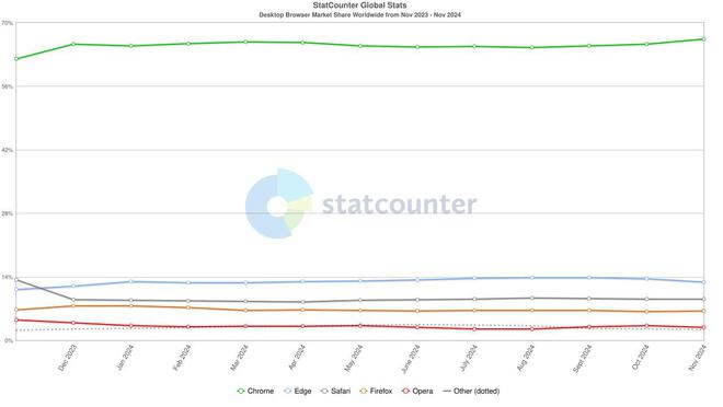 12 月 2 日消息,Statcounter 最新发布的 2024 年 11 月报告显示,桌面浏览器市场格局持续演变。谷歌 Chrome 浏览器继续稳坐头把交椅,微软 Edge 浏览器市场份额却出现了下滑。