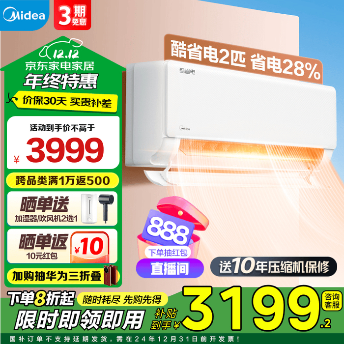 美的KFR-46GW/N8KS1-1新一级能效壁挂式空调2匹到手2776元