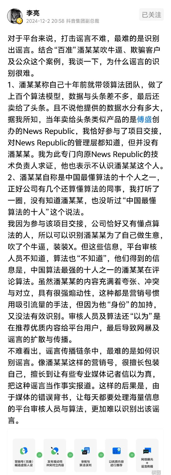 新浪科技讯 12月2日晚间消息,抖音集团副总裁李亮在其个人头条号上表示“对于平台来说,打击谣言不难,最难的是识别出谣言。”并表示,那些内容充满着夸张、冲突与对立,具有很强煽动性,都是营销号惯用吸引流量的手法,但因为发布内容者的“身份”加持,审核人员及算法还“以为”是在推荐优质内容给平台用户,最后导致网暴及谣言的扩散与传播。”该内容意在回应抖音平台网暴及谣言扩散和传播的根本原因。