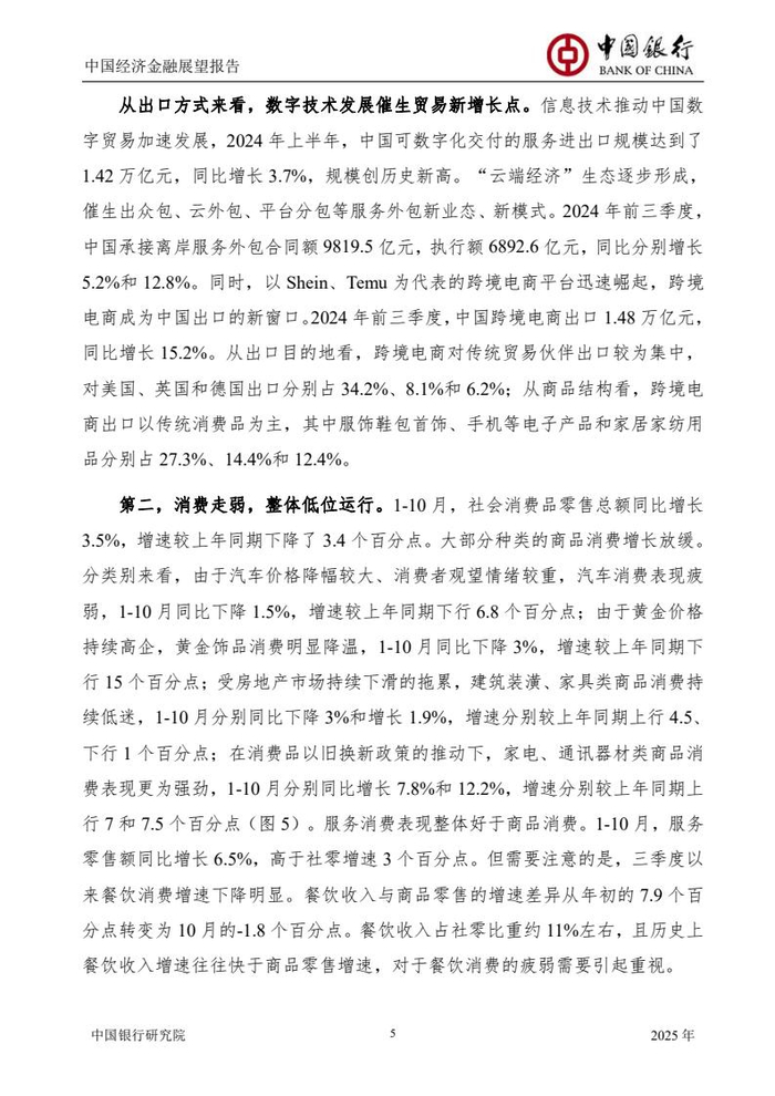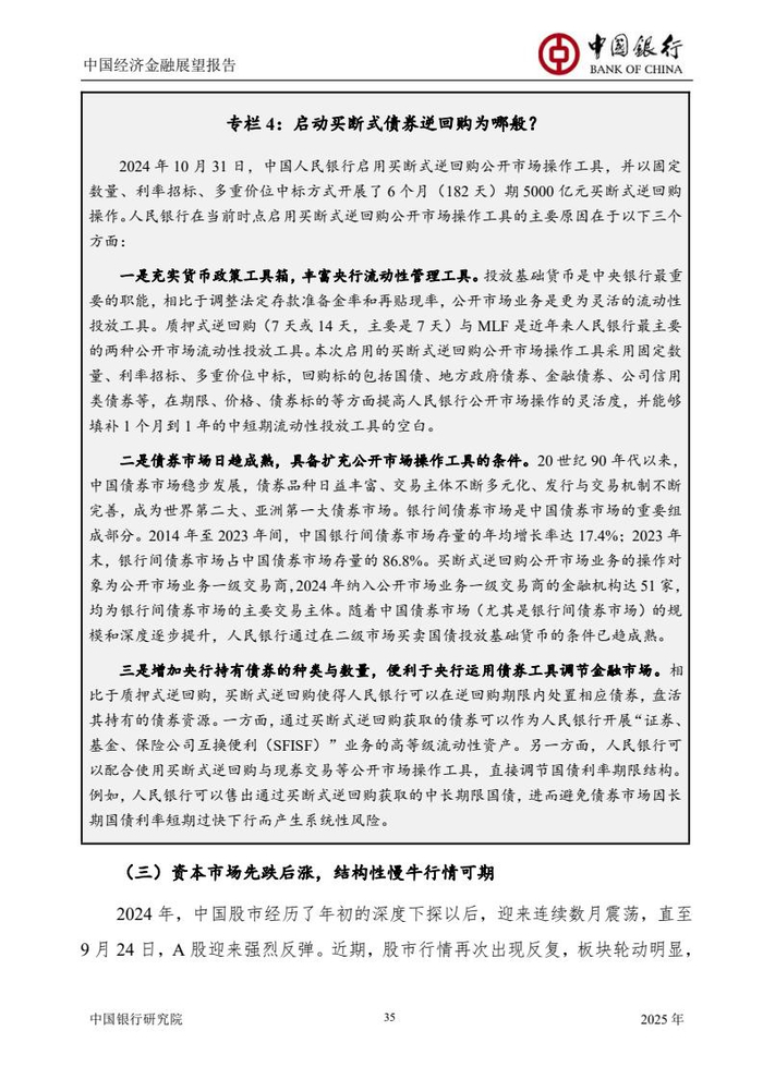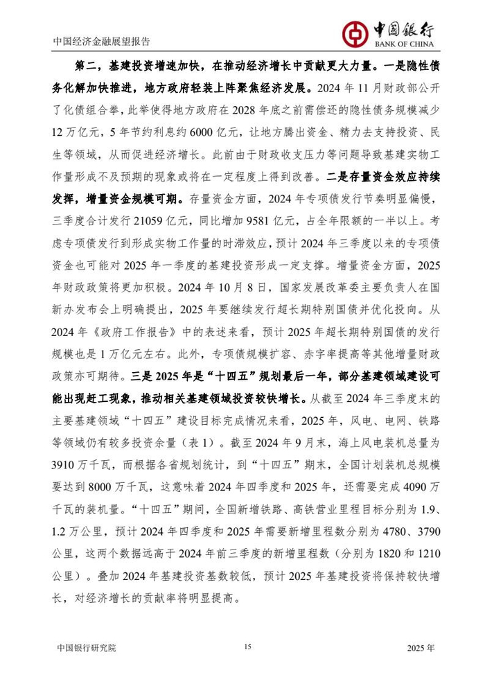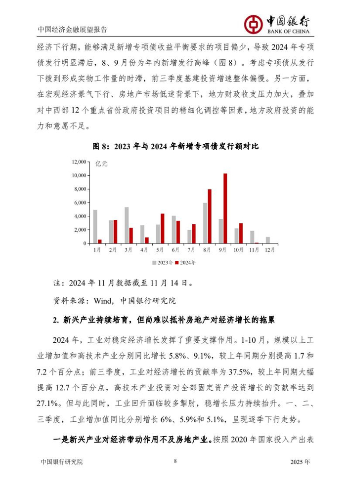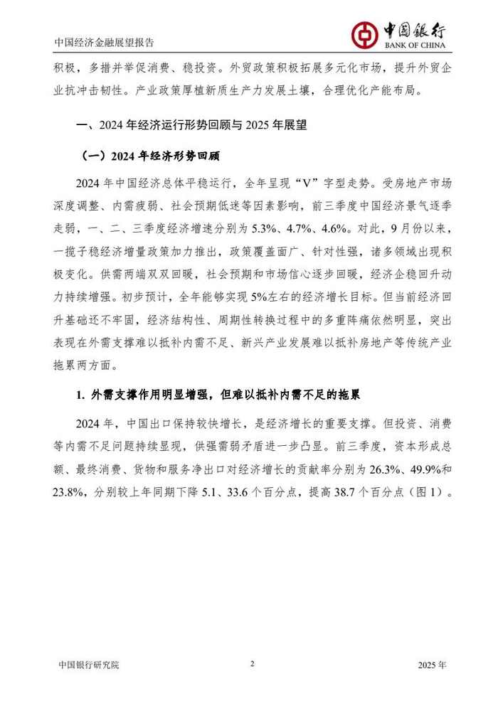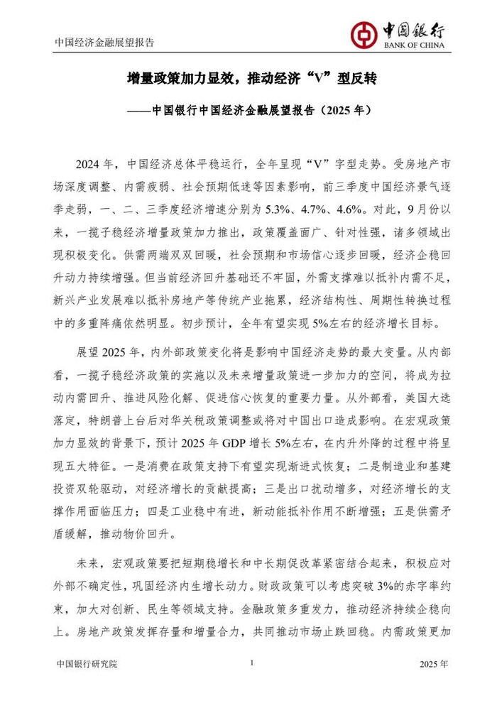 2024年,中国经济总体平稳运行,全年呈现“v”字型走势。前三季度经济景气逐季走弱,9月份以来,一揽子稳经济增量政策加力推出,诸多领域出现积极变化。但当前经济回升基础还不牢固,外需支撑难以抵补内需不足,新兴产业发展难以抵补房地产等传统产业拖累,经济结构性、周期性转换过程中的多重阵痛依然明显。初步预计,全年GDP增长5%左右。