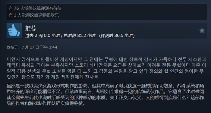 成长于这样的时代背景,难免会对快意恩仇、荡气回肠的武侠世界心生情愫。实际上你确实能在《活侠传》的Steam测评页面,找到那些至今仍在回味金庸小说的韩国玩家。