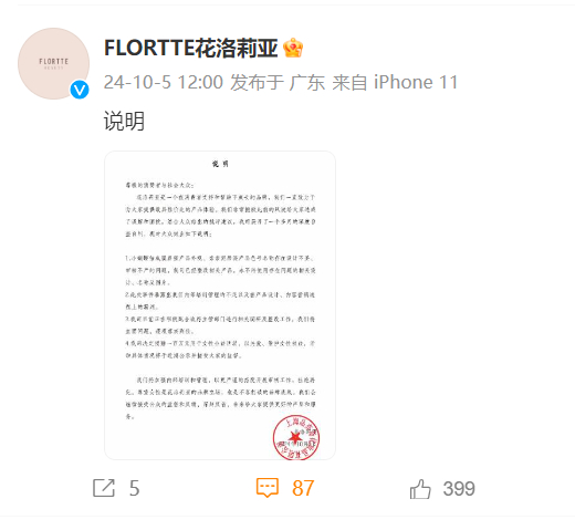 彼时FLORTTE花洛莉亚方面承认:“此次事件暴露出我们内部培训管理的不足以及在产品设计、内容营销流程上的漏洞。”