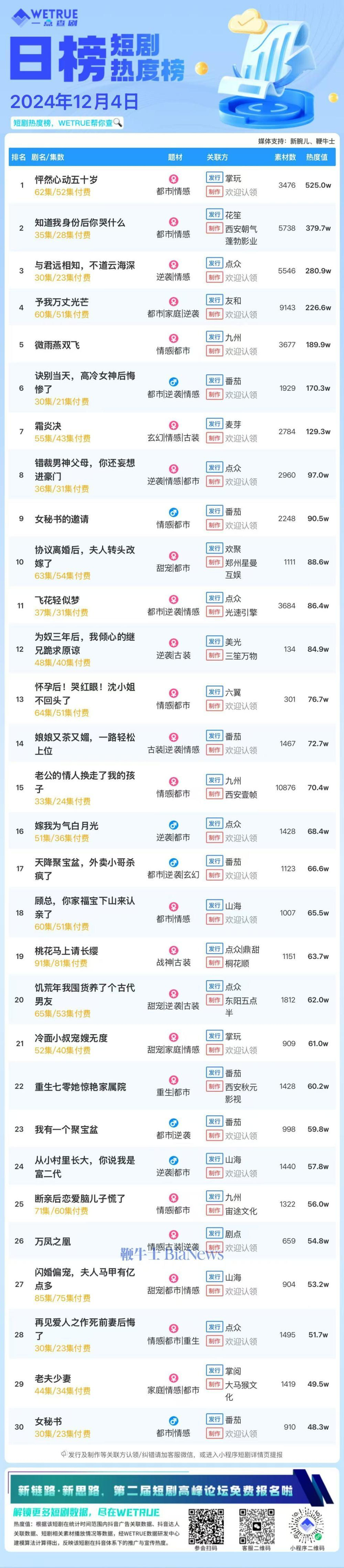 编者按:为帮助短剧从业者提供更多信息,专注于短剧报道的新腕儿和科技媒体鞭牛士联合WETRUE短剧热度榜共同推出短剧热度榜。