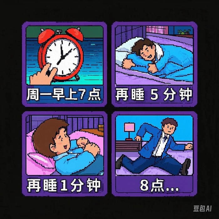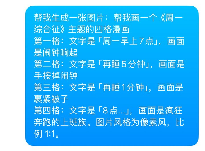 将特殊的风格和精准生成的中文字一起用,会有事半功倍的效果。结合像素风格,我们可以让豆包画一个四格漫画。