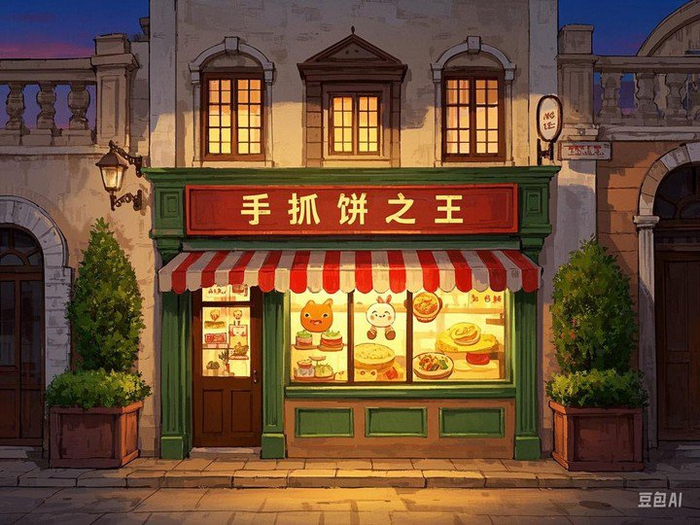 那咱们也可以复刻一个手抓饼大王的店面,不同以往的是,这次真的可以说中文,红色招牌上是工工整整的五个大字,而且 10 秒左右就搞定了。