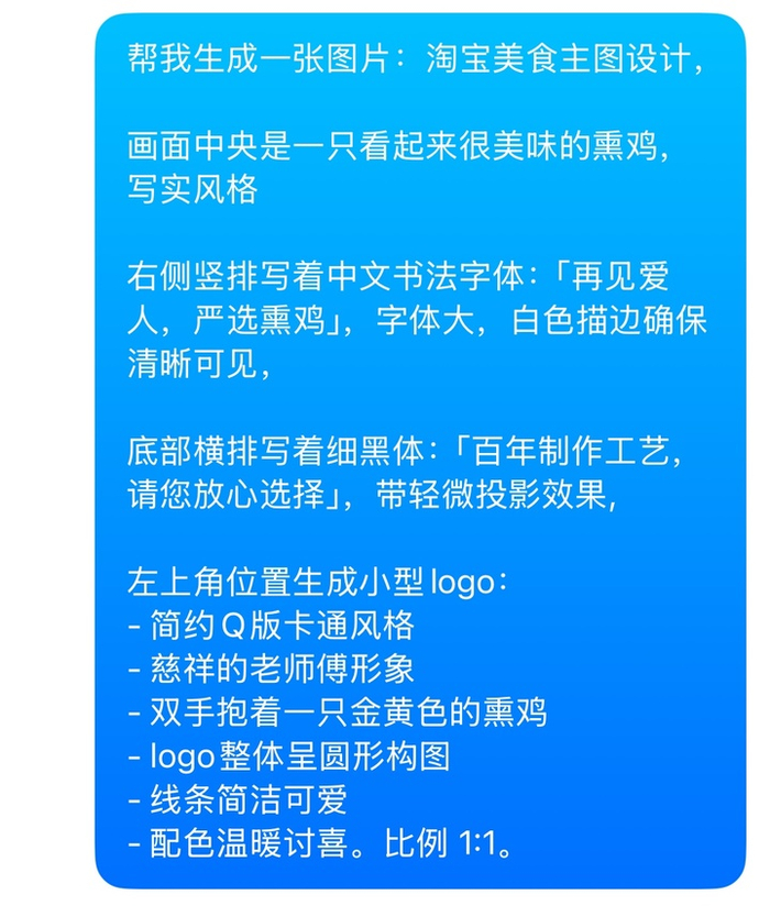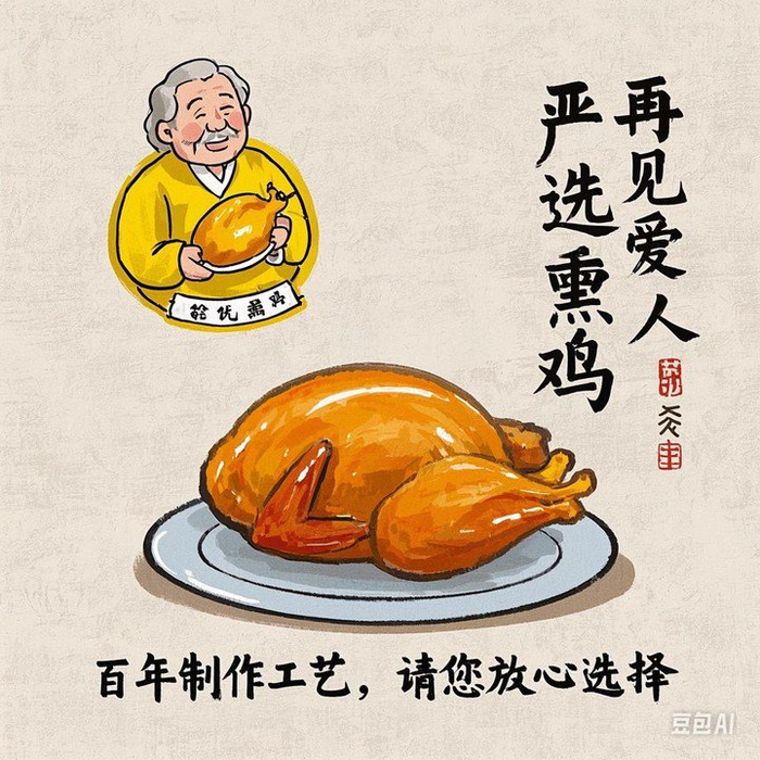 AI 生成具有不确定性,我反复生成了几次,还是最满意这张,虽然字体没有完全符合要求,熏鸡不够写实,小字乱码,但画风赏心悦目,熏鸡油光水滑。