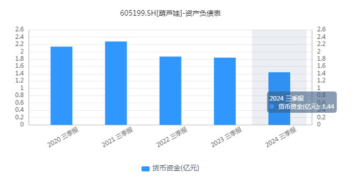 值得关注的是,葫芦娃的资金链严重紧绷,短债压力不容小觑。截至2024年三季度,葫芦娃货币资金1.44亿元,但短期借款就高达4.41亿元,一年内到期的非流动负债2.83亿元。