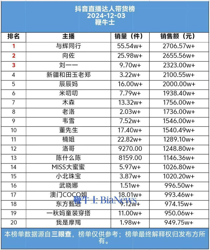 据鞭牛士每日发布的带货榜单,12月3日,向佐带货销售额为2655.56万元。