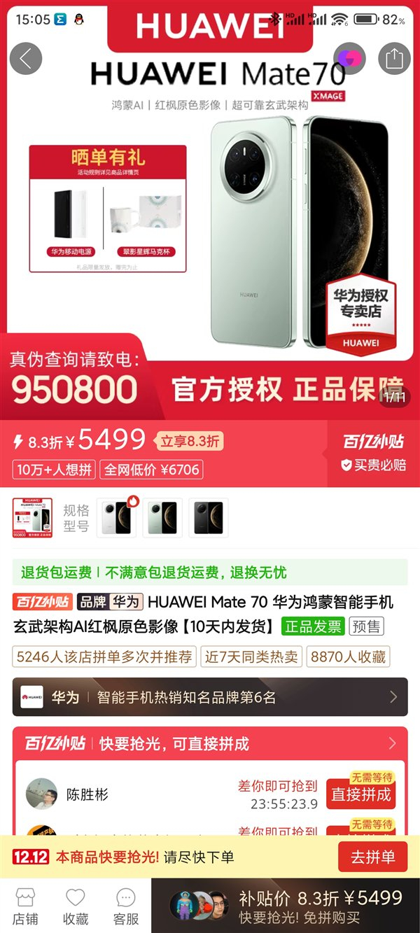 华为Mate 70上架拼多多百亿补贴:5999元现货抢