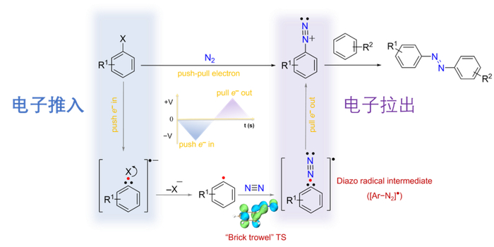 在这一策略中,电子不会被消耗但是能够参与反应,并能将氮气活化和固定为偶氮化合物,从而解决传统偶氮合成过程能耗较高和中间体较多等问题。