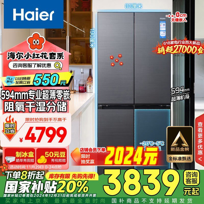 海尔超薄零嵌十字双开门冰箱只要3500元!海尔超薄零嵌冰箱只要3500元!