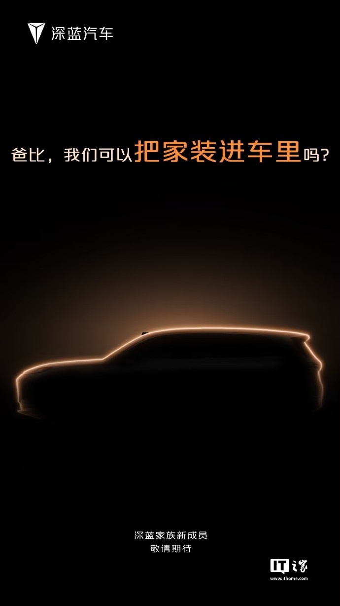 IT之家 12 月 8 日消息,今日深蓝汽车官方发布了全新 SUV 的预告图,图片显示这款新车采用全新设计风格,号称“把家装进车里”,预计为 6 座或 7 座设计。目前,深蓝旗下的 SUV 车型包括 S05、S07 和 G318 三款,分别定位为紧凑型、中型和中大型 SUV,三款车型均采用 2+3 式 5 座布局。