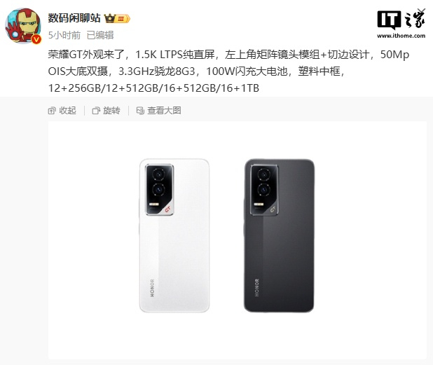 IT之家 12 月 9 日消息,荣耀手机今日官宣荣耀 GT 将于 12 月 16 日 19:30 发布,并公布新机外观照。随后,博主 @数码闲聊站 曝光了这款新机的主要参数: