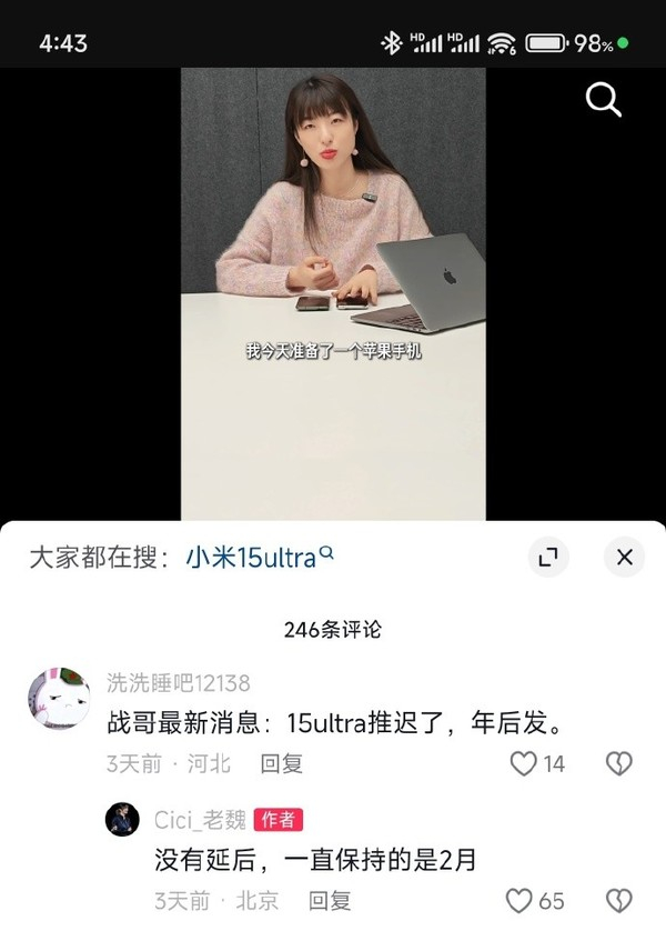 关于小米15 Ultra可能推迟发布的消息,小米集团公关部总经理王化此前已经辟谣,他称一切都在按部就班地进行中。他特别提到,不能简单地用去年的时间表来预测今年的活动,因为每年的情况都会有所不同。