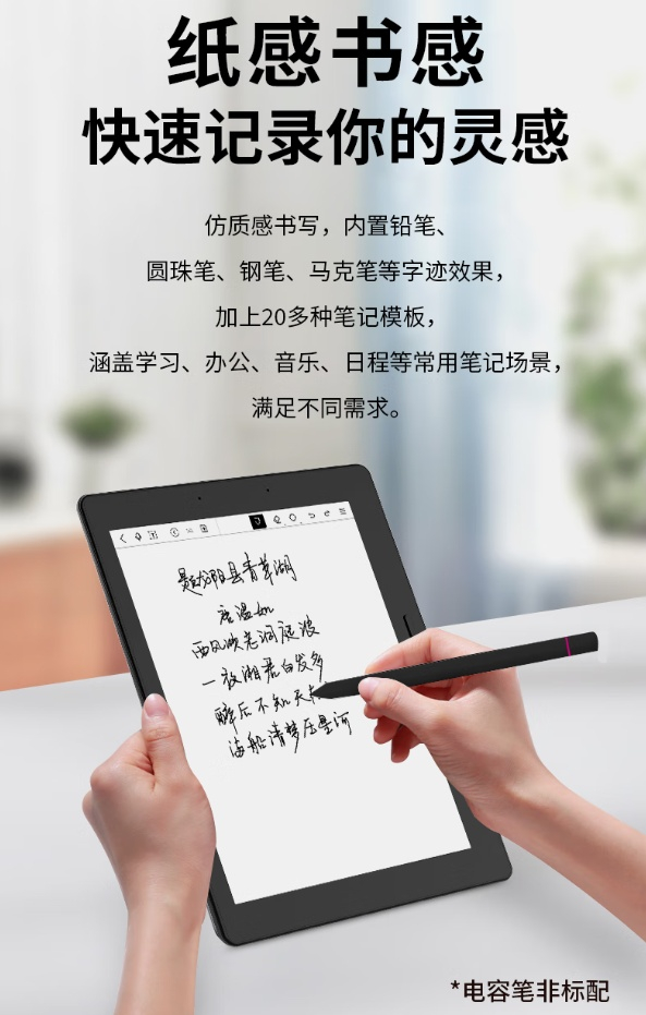 该款读写本提供 USB、WiFi、微信、网盘等传书方式,支持查阅 pdf、html、epub、rtf、fb2、txt、mobi、doc、azw3 等格式文件。读写本还拥有电容笔配件,支持仿质感书写,内置铅笔、圆珠笔、钢笔、马克笔等字迹效果。