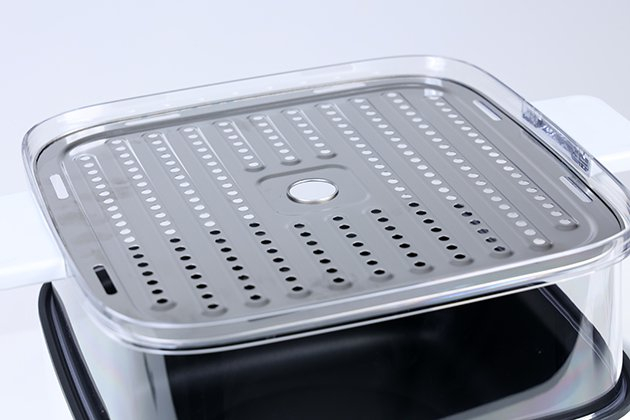 两个蒸架也相当精致,食品级304不锈钢材质,凹槽的开孔,避免蒸食物时水蒸气凝水泡发,保证更好的口感。