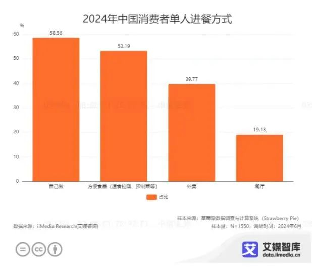 在这种情况下,许多一人食的顾客不得不选择其他方式满足用餐需求,根据Media Research(艾媒咨询)数据显示,在单人进餐时,58.56%的消费者选择自己做饭,53.19%的消费者选择购买方便食品(速食拉面、预制菜等),39.77%的消费者选择点外卖,仅有19.13%的消费者会去餐厅就餐。
