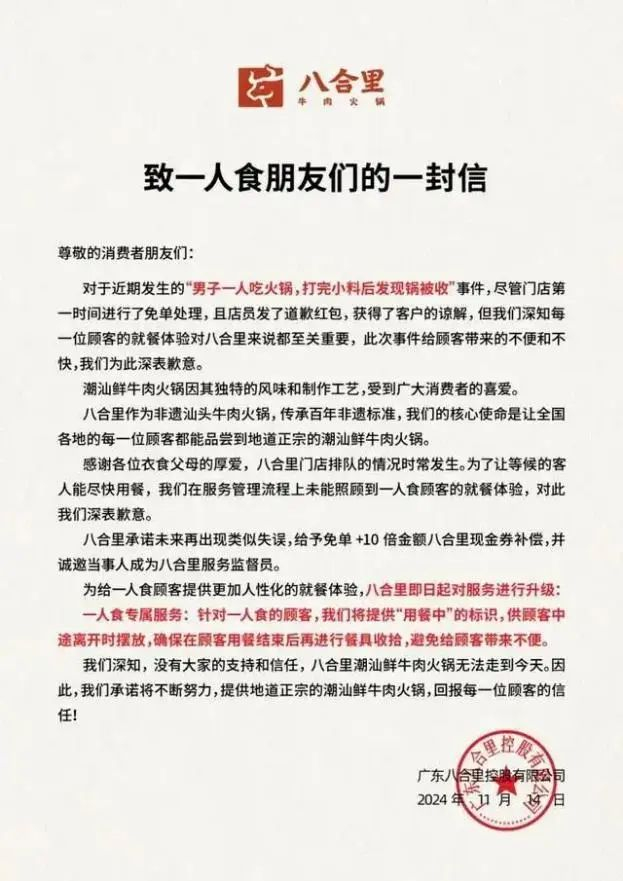 面对此次一人食被收餐的舆情事件时,八合里做出了优秀的公关回应,及时对受到影响的客户进行道歉并给予补偿,为独自来用餐的客户提供“暂时离开”的指示牌,同时推出了,包含锅底,牛肉,素菜,调料的“单身牛族”套餐以体现对于“一人食”顾客的尊重,将此次的舆情事件转化为机遇,拉了一波好感。