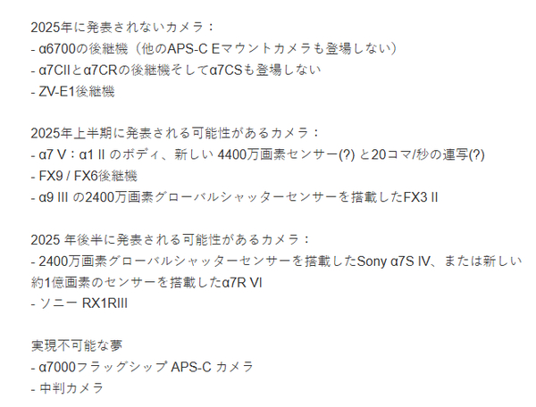 首先是基本确定不会在2025年发布的相机,包括索尼α6700的迭代产品,其他采用E卡口的APS-C画幅相机也不会在2025年发布。同时,索尼α7 CII和α7 CR的迭代机型、α7 CS、ZV-E1的迭代机型均不会在2025年发布。