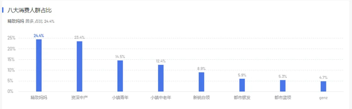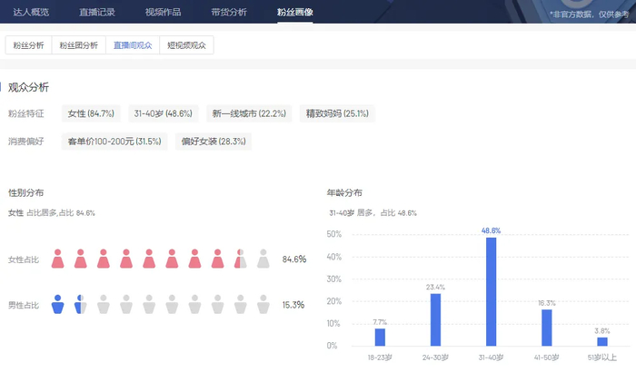 从直播间观众及粉丝画像可以看到,五谷磨房直播间观众画像主要集中为31-40岁的女性,消费人群主要为精致妈妈和资产中层。