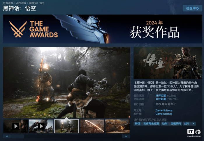 IT之家 12 月 13 日消息,在目前正在进行的 TGA 2024 颁奖典礼中,游戏科学的《黑神话:悟空》获得最佳动作游戏奖。