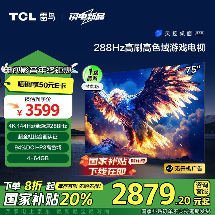 卓越TCL雷鸟鹏7 25款75英寸4K智能电视:大屏视觉享受,节能游戏利器