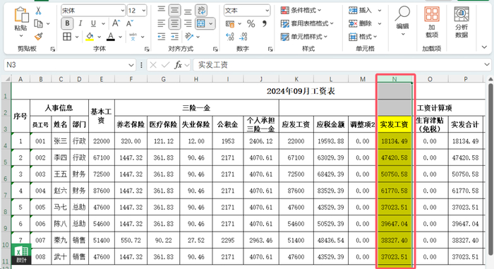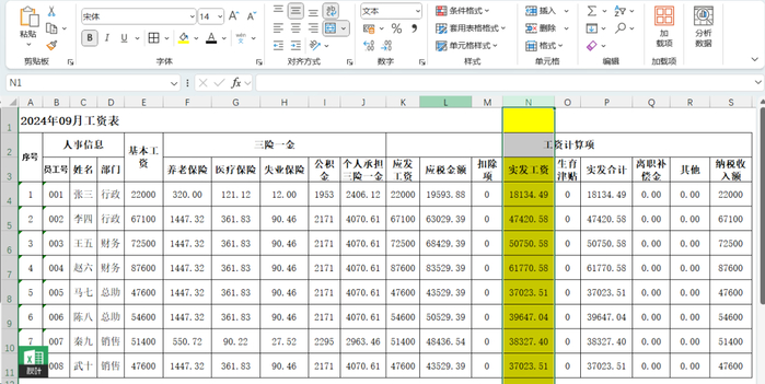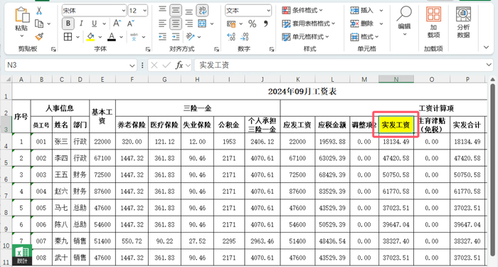 我们现在想对【实发工资(N)】这一列突出显示(即:填充上颜色),以方便观察数据。