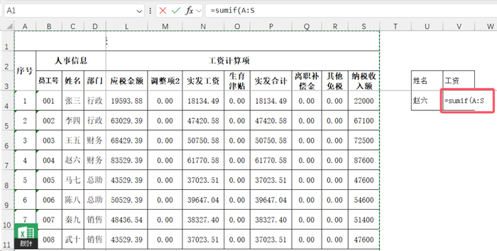 比如,我们现在需要查找【赵六】这个人的实发工资。