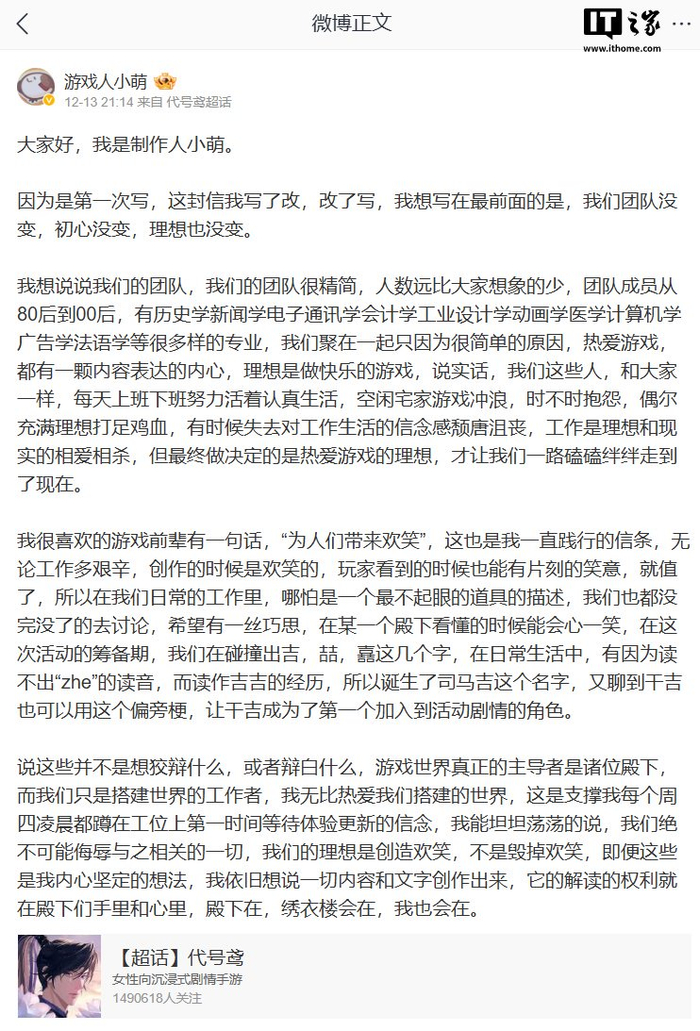 IT之家注意到,《代号鸢》《如鸢》制作人“小萌”昨天晚上还发布了一段长文来对这起事件进行解释,她表示团队没变、初心没变、理想也没变。