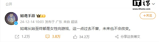 此外,《如鸢》官方今天也发了一段话来进行解释:如鸢从始至终都是女性向游戏,这一点过去不曾,未来也不会改变。