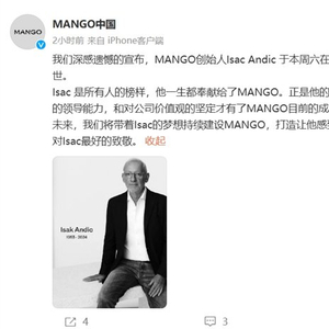 未来,我们将带着Isac的梦想持续建设MANGO,打造让他感到自豪的品牌,这是对Isac最好的致敬。”