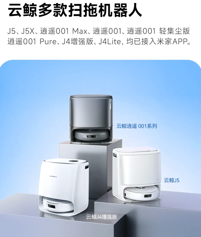 IT之家注意到,目前云鲸 J5、J5X、逍遥 001 Max、逍遥 001、逍遥 001 轻集尘版、逍遥 001 Pure、J4 增强版、J4Lite 等扫拖机器人均已接入米家 App。