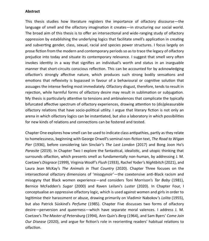 她的论文探讨了“为什么上个世纪的某些作家使用与气味相关的语言来刻画对厌恶和欲望对象的负面态度”。她补充道:“我借鉴了有关‘嗅觉偏见’的丰富历史记录,以研究其当代意义。”