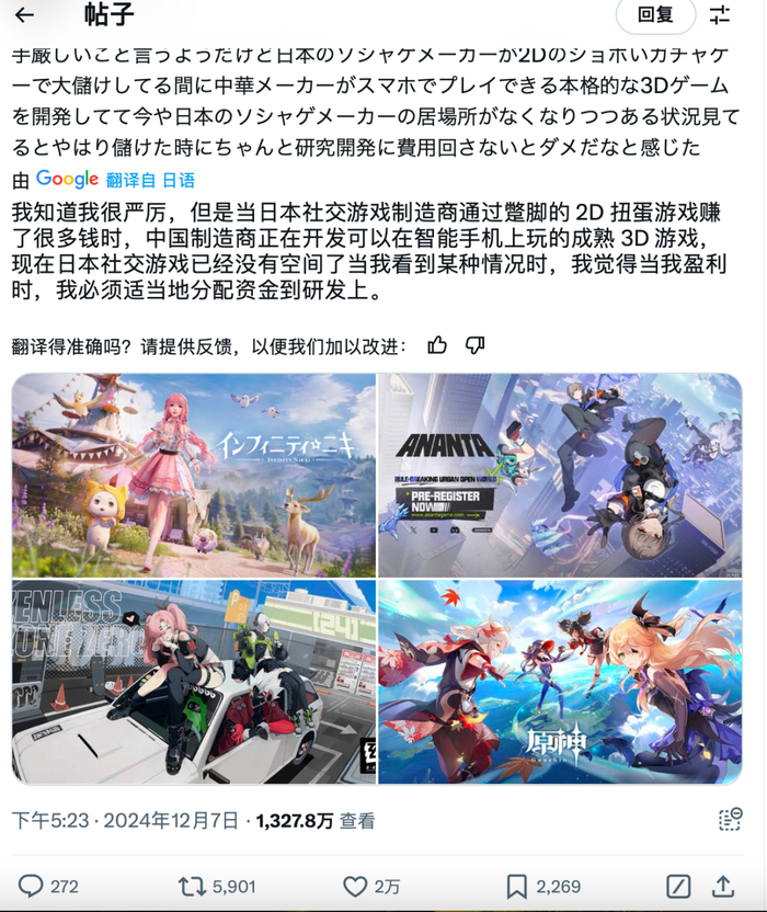 一位较为熟悉中国游戏的日本从业者也向我们提到了一个有趣的现象:一方面现在中国游戏尤其是手游在日本很容易受到关注,因为美术表现和技术力明显强于日本的平均水平,以至于一些玩家来TGS是冲着试玩中国游戏来的。而就在前些天,“中国3D手游压缩日本抽卡手游生存空间”还在日推上成为了热门话题。