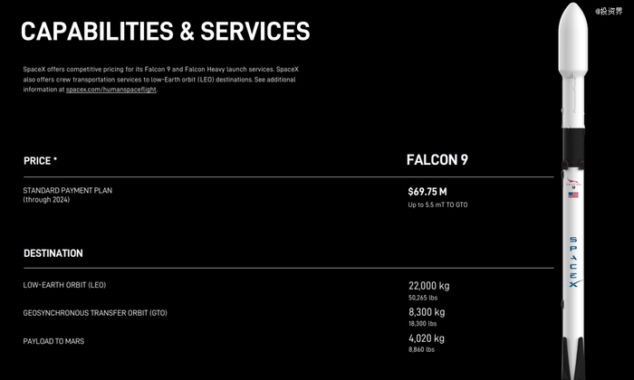 而真正令SpaceX声名大噪的则是猎鹰9号火箭。官方最新参数显示,在役的猎鹰9号运载火箭低地球轨道运力为22吨,可以将8.3吨的物资送往同步转移轨道。值得一提的是,猎鹰9号早在2015年12月就成功完成首次火箭回收,震惊世界。