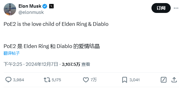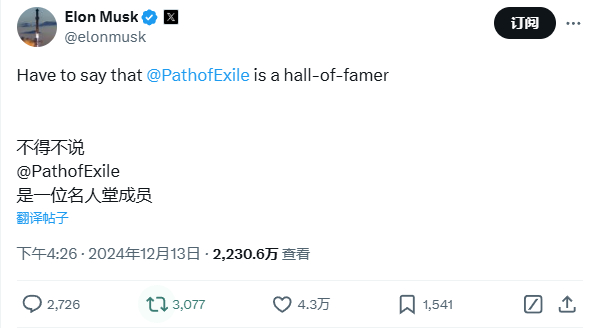 12 月 7 日,《流放之路 2》国际服抢先体验版正式上线,热度空前,上线第二天仅 Steam 就有约 54 万人同时在线。作为暗黑系列骨灰级玩家,马斯克首发当天就发文表示自己已经玩上了这款游戏(职业武僧,ID 为 MonkEBizznizz),并称其为“艾尔登法环与暗黑破坏神完美结晶”。