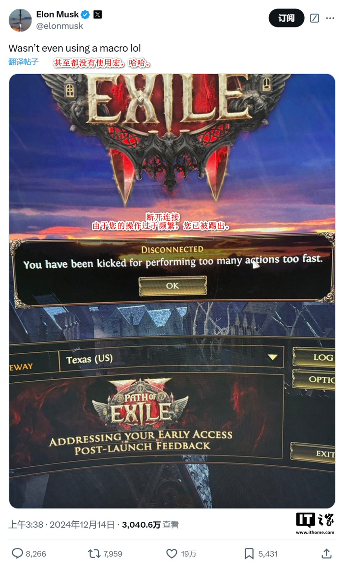 马斯克因 APM 异常而被《流放之路 2》踢出游戏,本人坚称没有开宏