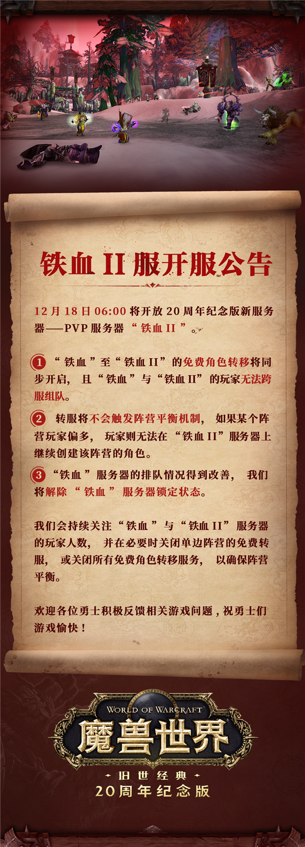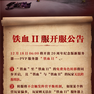 暴雪称会持续关注“铁血”与“铁血II”服务器的玩家人数,并在必要时关闭单边阵营的免费转服,或关闭所有免费角色转移服务,以确保阵营平衡。