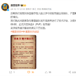 新浪科技讯 12月18日上午消息,近日,魔兽世界旗下铁血服存在人数过多导致服务器出现排队,严重影响玩家游戏体验的情况。昨日晚间,魔兽世界官方微博回应称:“我们就此问题紧急与暴雪团队展开沟通并进行了技术评估,决定将于12月18日06:00,正式开启铁血II(PVP)服务器!”