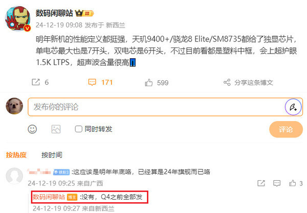 然而,尽管硬件配置令人期待,但该博主同时也指出了一些可能存在的问题。他表示,目前来看这些手机都是塑料中框设计,预计精致度和质感一般。不过,所有机型都会采用超护眼1.5K LTPS屏幕,并且超声波含量也很高。有网友调侃称,“iQOO最难的技术就是金属边框”。