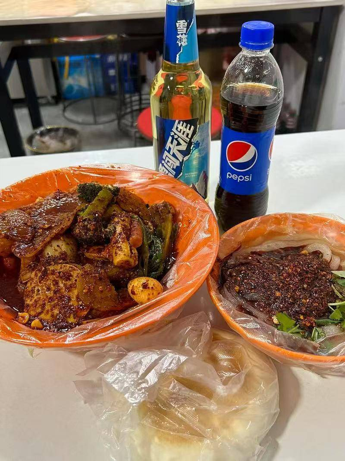 一瓶啤酒、一瓶可乐、一个馍、一碗麻辣宽粉,再加上一份素麻辣烫,这是王瑞在直播之余最平常不过的一顿晚餐。她告诉记者,年关将至,直播工作更忙碌了,“整个人还有点内耗”。“不过,作为天水本地人,没有什么不是一碗麻辣烫可以解决的。”