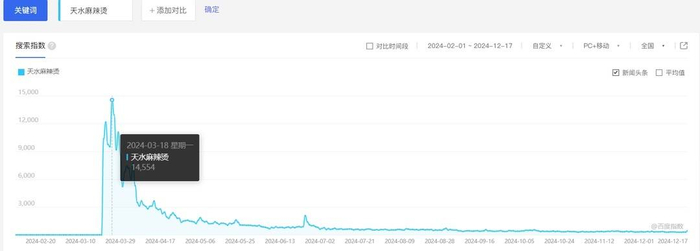天水麻辣烫确实火过。据百度指数显示,在2024年3月中旬起突然走高,其搜索指数一度飙升至1.46万,随后的一个月里逐步下降,到9月份时已归于平常。这就像是进化论里的“回归平均”;当流量褪去,每种味道都会归回它本来的受众。