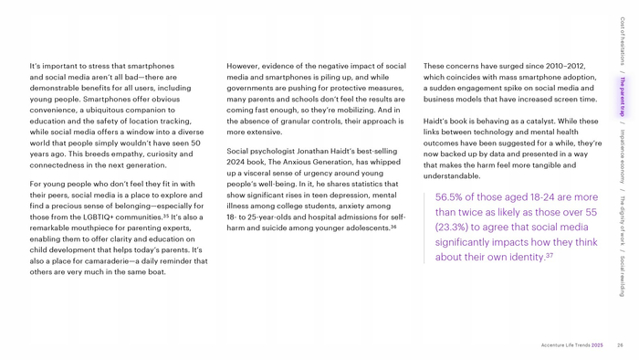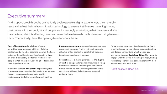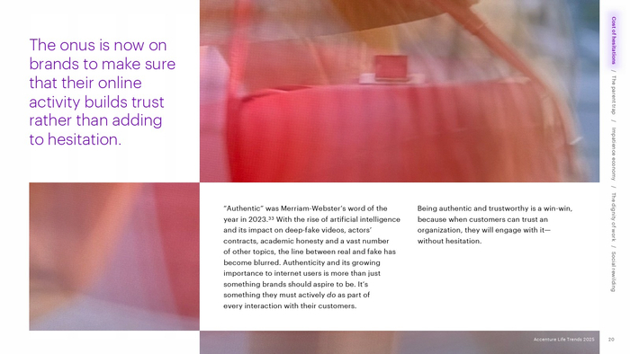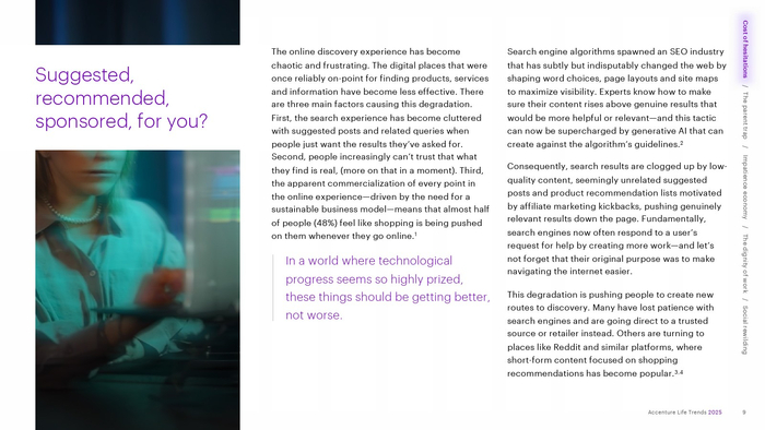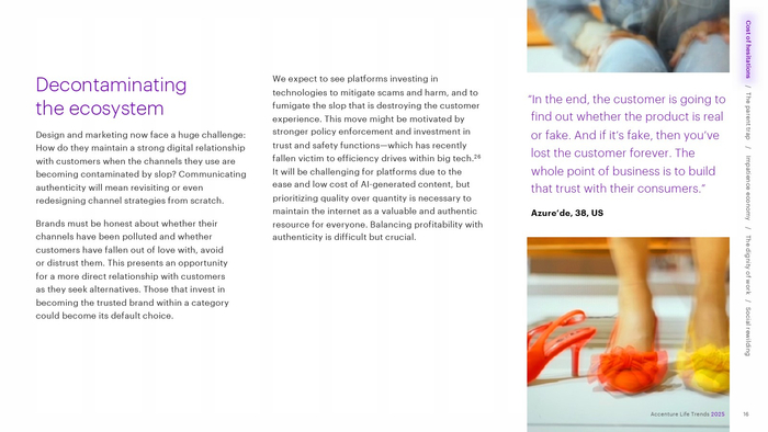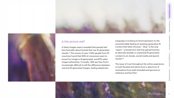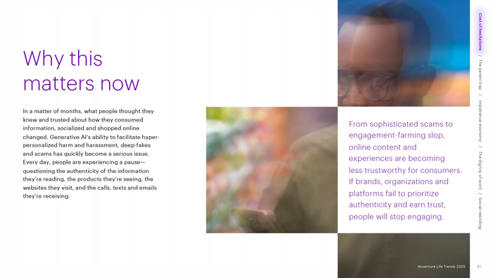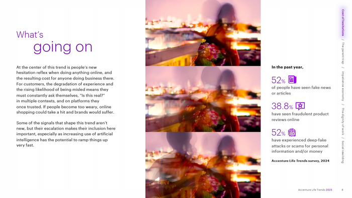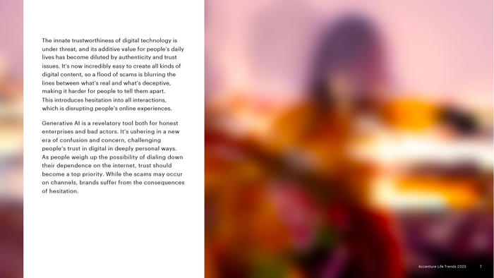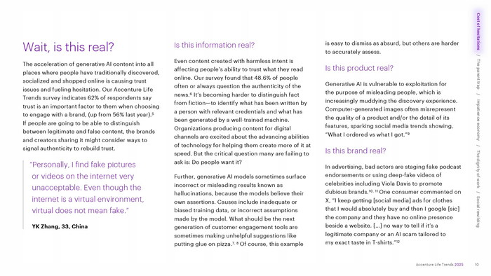 埃森哲发布了“2025年生活趋势报告”。超过一半的人比以前更多地质疑他们在网上获得的内容。62%的人表示,在选择与品牌互动时,信任是一个重要因素。